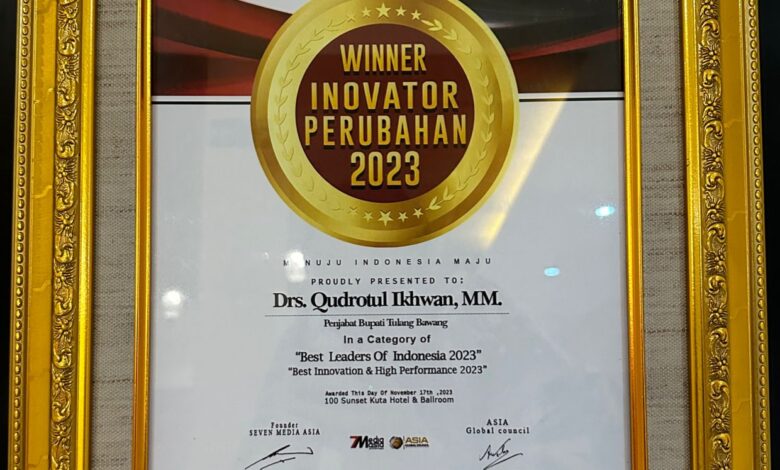 Lampung24.com, Tulang Bawang- Pejabat Bupati Tulang Bawang Drs Qudrotul Ikhwan MM Kembali meraih Anugerah Penghargaan Sebagai Kepala Daerah Dengan Kinerja Terbaik Tahun 2023 Kategori ” Inovator Perubahan ” Dari Seven Media Asia di 100 Sunset Kuta Hotel & Ballroom, Pulau Dewata Bali, Sabtu (17/11/2023).
