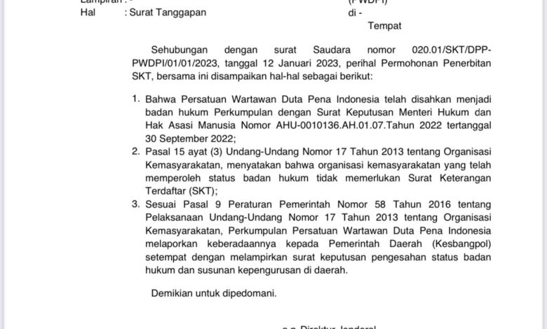 Dalam surat keputusan yang baru saja diterbitkan, Kemendagri secara resmi menyatakan bahwa badan hukum PWDPI telah sah dan diakui. Hal ini memberikan legitimasi penuh bagi PWDPI untuk beroperasi sebagai organisasi profesi wartawan di Indonesia. Sebagai konsekuensi dari pengakuan ini, PWDPI kini diharuskan untuk mendaftarkan organisasinya ke Badan Kesatuan Bangsa dan Politik (Kesbangpol) di seluruh provinsi di Indonesia.
