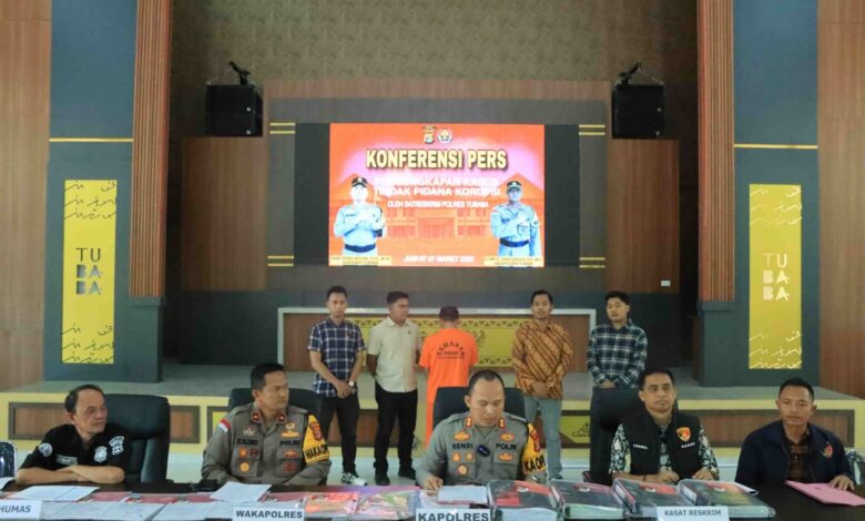 Lampung24.com, Tulang Bawang Barat- Polres Tubaba Polda Lampung menggelar jumpa pers terkait kasus korupsi APBTiyuh (Anggaran Pendapatan dan Belanja Tiyuh) Suka Jaya Kec. Gunung Agung Kab Tubaba di Aula Sarja Arya Racana Mapolres Tubaba, Jumat (07/03/2025) Siang
