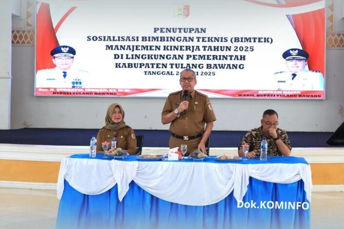 Lampung24.com, Tulang Bawang- Sekretaris Daerah Kabupaten Tulang Bawang, Ir. Ferli Yuledi, secara resmi menutup kegiatan Sosialisasi dan Bimbingan Teknis (Bimtek) Manajemen Kinerja Tahun 2025 yang dilaksanakan di Gedung Serba Guna (GSG) Tulang Bawang. Kegiatan ini diikuti oleh 50 Aparatur Sipil Negara (ASN) dari berbagai organisasi perangkat daerah (OPD) di lingkungan Pemkab Tulang Bawang. Selasa 24 Juni 2025.